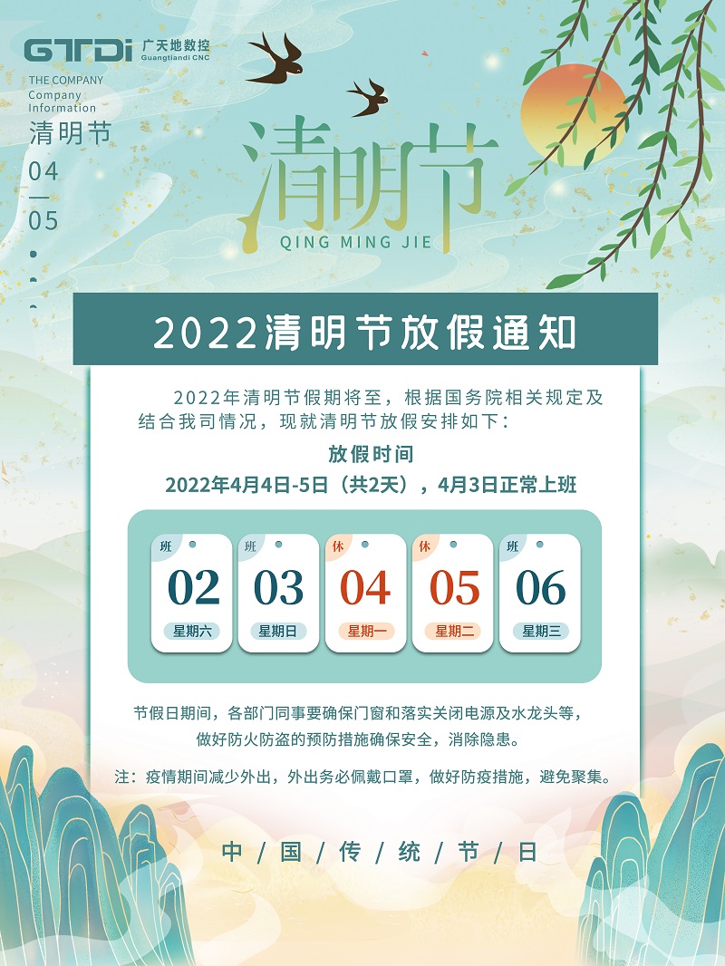 根据国务院办公厅《关于2022年部分节假日安排的通知》,并结合我司实际情况,亚星|会员数控2022年清明节放假安排如下: